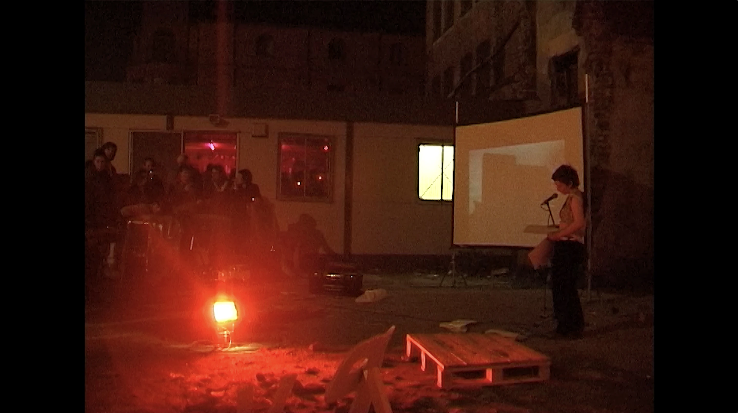 The film itself plays with contradictions. What we see, hear, and ultimately get, are not one. It opens with a scripted performance of two young men in a quintessential suburban area of Northern Ireland. They approach a home and at its entrance question its resident if she knows Margaret. The scene plays with documentary conventions, presenting a clearly scripted and slow dialogue to contrast with what we are seeing, including a sort of denied reverse shot with an off-screen, invisible, silent husband. We leave the unresolved and strange conversation and are now faced with a bus stop, red-lit, contrasting against the backdrop of a blue dusk. On many occasions, the film’s aesthetic is, serendipitously, reminiscent of the works of Megan Doherty and Audrey Blue—two young women artists from Northern Ireland—works which also make use of blurring the lines between fiction and documentary. Sheltering under this uncanny bus stop, we meet two young women on their way to a night out, but the conversation here is far from friendly and casual, possibly to our surprise, it is a political discourse, again unexpected and urgent. We are then transported to a bar, where a staff member recites a text directly into the camera. At first it sounds like a witness testimony, then we realise it is a poem. The young woman's voice is seamlessly transitioned into another, into Allen’s, the historic and contemporary merge. We are now at the nexus of the film, witnesses to the VHS footage of Allen’s reading and performance in Klub from 2001. This is the moment when everything becomes real, the noise settles, and a sort of clarity or consolidation arrives, softly but all at once. The film ends in a static, blue, night time landscape. We listen to a collective of young women’s voices, speaking about their experience of being the post-Troubles generation, the experience of being a female in Belfast, and about silence.