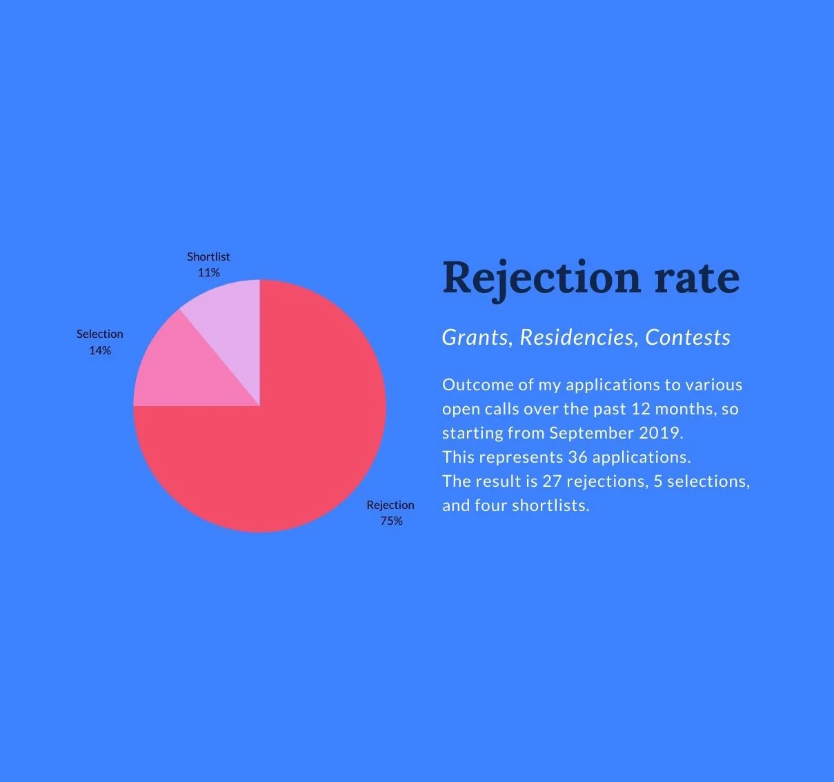 The way we present ourselves matters greatly. We share our success and we congratulate our peers on their accomplishments – even in instances where it reminds us of our own lack of envisioned success. However, we keep very shy about our failed attempts and the rejection we face. In September 2020, I made a list of all the opportunities that I applied for in the preceding 12 months. These were opportunities I directly applied for, excluding any opportunities where I was approached or that organically emerged from new encounters. This covered those instances where I was searching for open calls, reaching out to publishers, spending time writing motivational letters for government funds, residencies, formatting files, selecting images, and on many occasions paying application fees. This list represented 36 applications out of which my work was selected 5 times and another 4 where my work was shortlisted. None of the shortlisted works were successful, giving me a 75% percent rejection rate.
